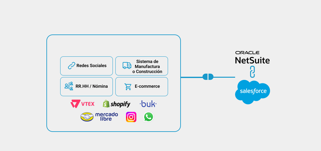Conecta NetSuite y Salesforce, o cualquier otro sistema. Ya tenemos la integración NetSuite–Salesforce lista para usar. ¿Tienes un POS, eCommerce, sistema de manufactura u otro sistema propio? Nos encargamos de conectarlo.